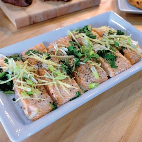 - Heat olive oil and get very hot. Place salmon fillets on a cookie sheet and sprinkle cilantro, spring onions, ginger and pour hot olive oil over all of it.