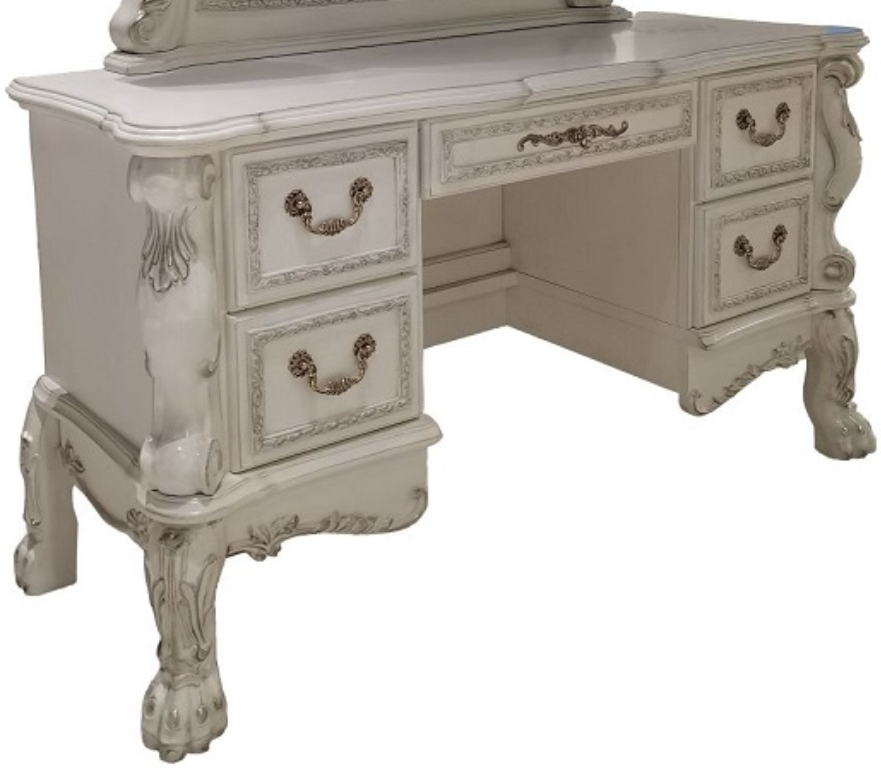 Expertly detailed, this gorgeous vanity desk highlights elaborate carvings on its frame. This vanity desk is finished in an elegant bone white with hand-brushed silver accents and sits on elegant claw feet.