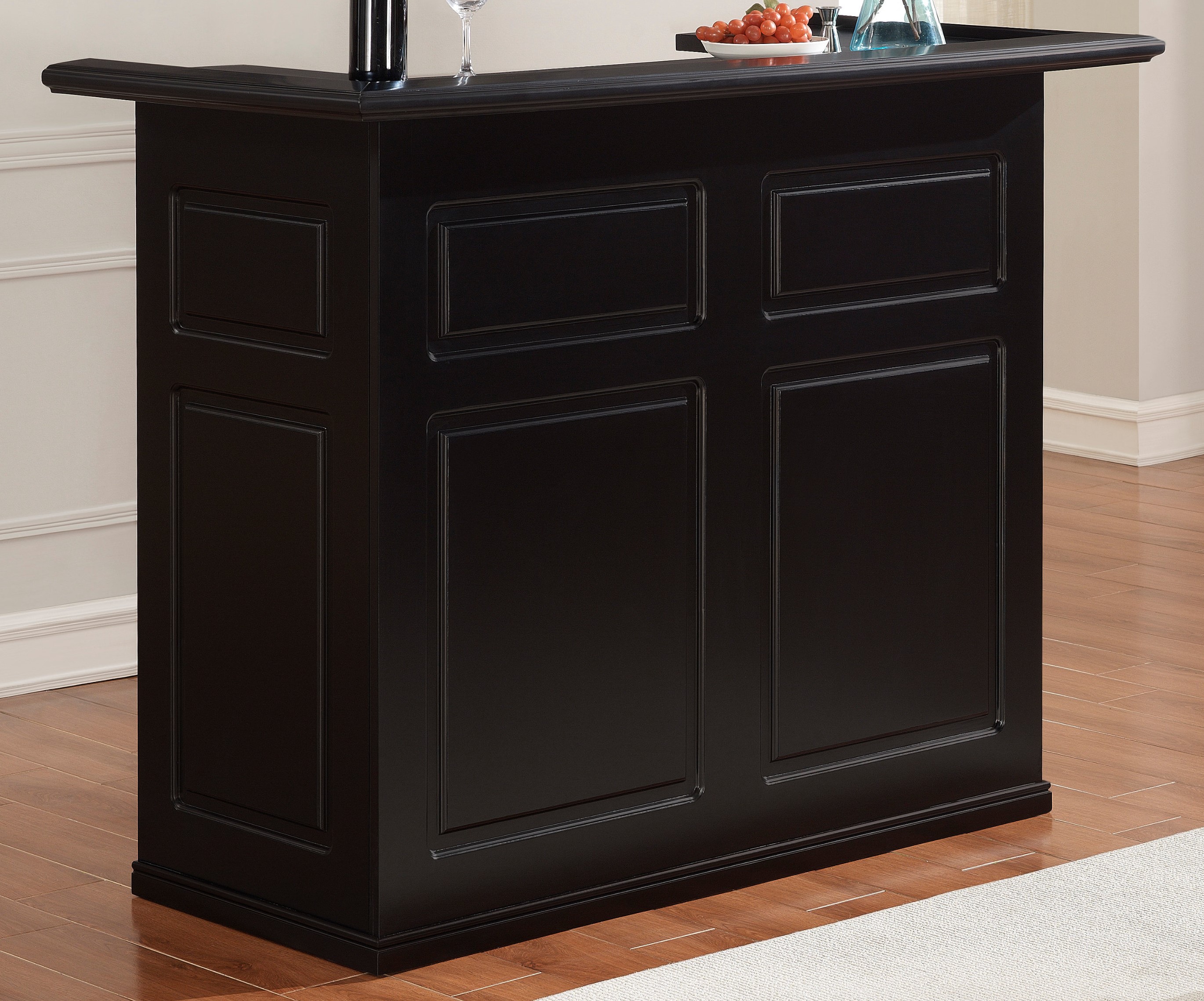 The Trenton Bar is finished in Black with decorative front panels, open space for a fridge and storage shelving. This product is made of Birch Veneer and Solid Poplar.