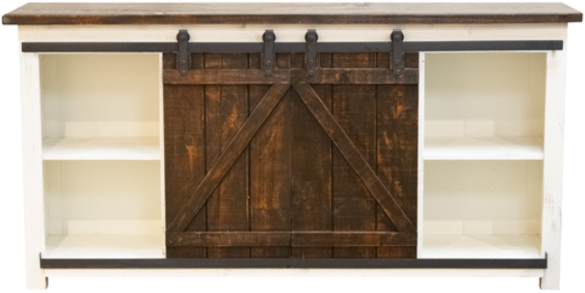 Rodeo White TV Console features rodeo top and nero white finish with sliding barn doors and black metal hangers gives any room a rustic and charming look. This TV stand is a practical and stylish piece of furniture that can accommodate your entertainment needs.Read More