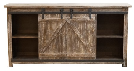 Barnwood TV Console features a barnwood finish with sliding barn doors and black metal hangers give any room a rustic and charming look. Make a bold statement and involve this sectional in your living room design.Read More