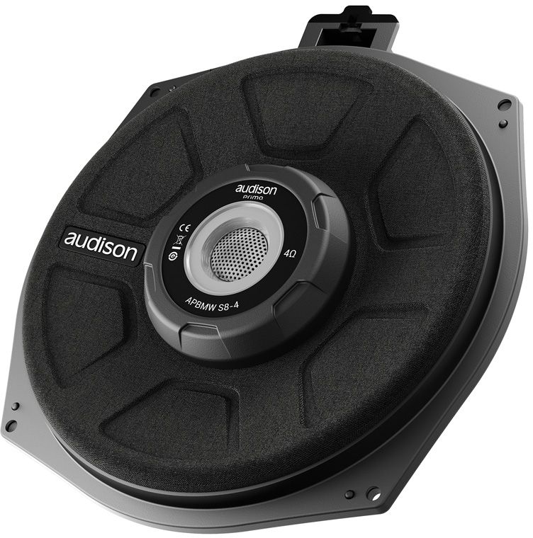 The 200 mm (8″) APBMW S subwoofers allow a “direct replacement” of the OEM speakers underneath the front seats, making the most of the factory acoustic load and generating deep and crisp low frequencies. You can choose between S8-2 with 2 ohm impedance and S8-4 with 4 ohm impedance for improved system composition versatility. In fact, in the mid-high passive filtered system configuration, with the crossover provided, 4 of the 8-channels of the AP 8.9 bit can be configured in bridge mode delivering 130W rms to each S8-4 installed under the seat. The S8-2 can be used in a fully active, multi-amplified front system, maximizing the power of the AP 8.9 bit at 2 ohms, and employing additional 2 channels for the rear system. The Neodymium magnet used on S8-4 and S8-2 allows for greater power and control than ferrite, while maintaining the depth of installation unaltered.