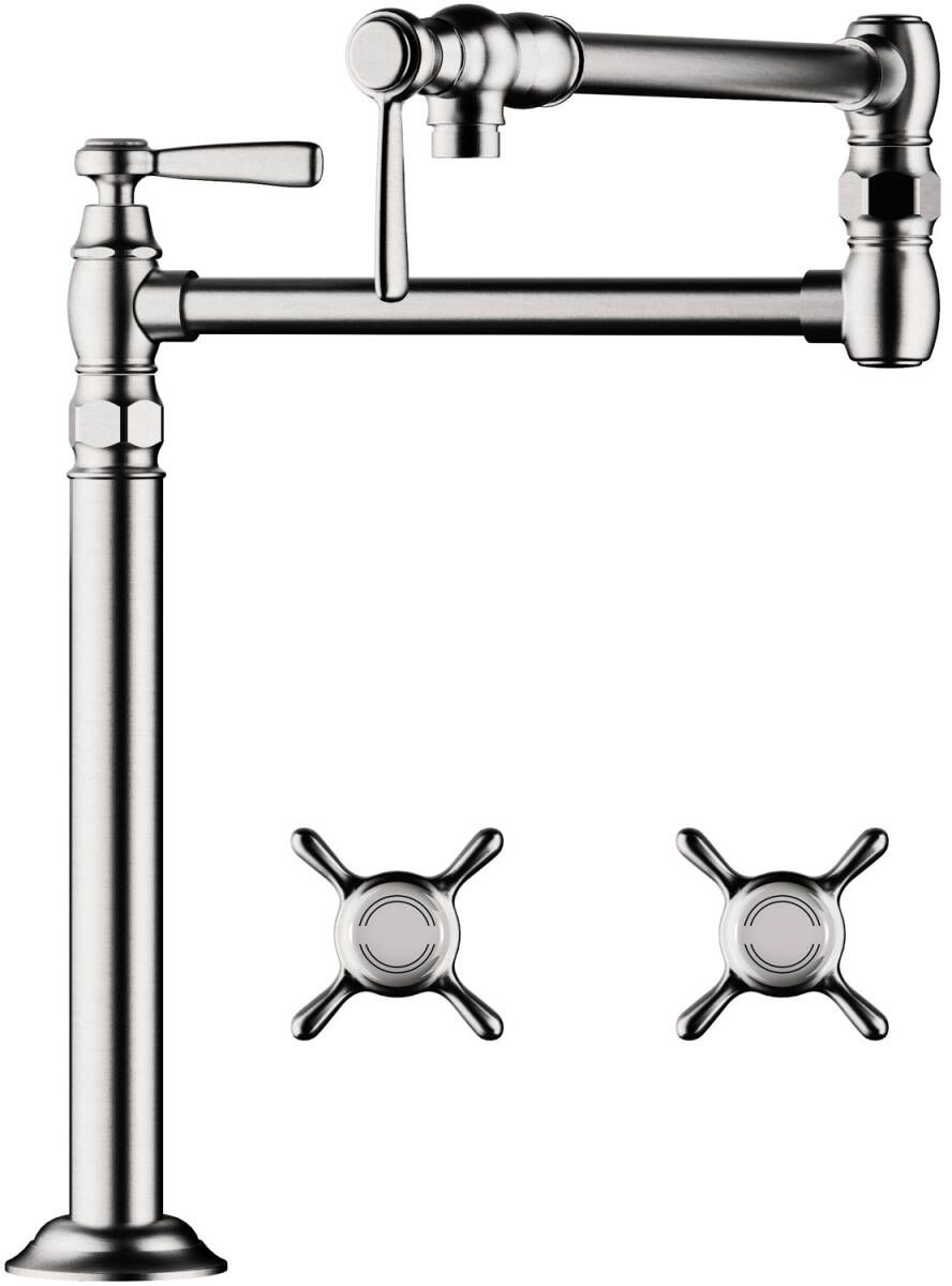 Chrome finished pot filler that includes cross and lever handles.Read More