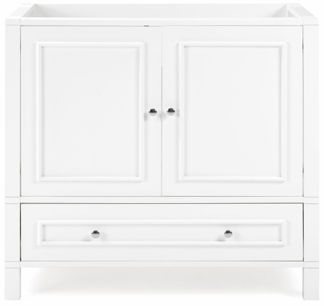 This vanity is sure to be the focal point in your bathroom. Strong lines and nickel hardware hardware blend seamlessly to elevate your everyday bathroom style with charm. The cabinet offers spacious storage for linens, toiletries, or other bath essentials, and soft-close doors drawers ensure discreet, quiet operation. Constructed of solid pine and composite wood with polished nickel hardware and a beautiful white finish that is designed to complement any decor.Read More
