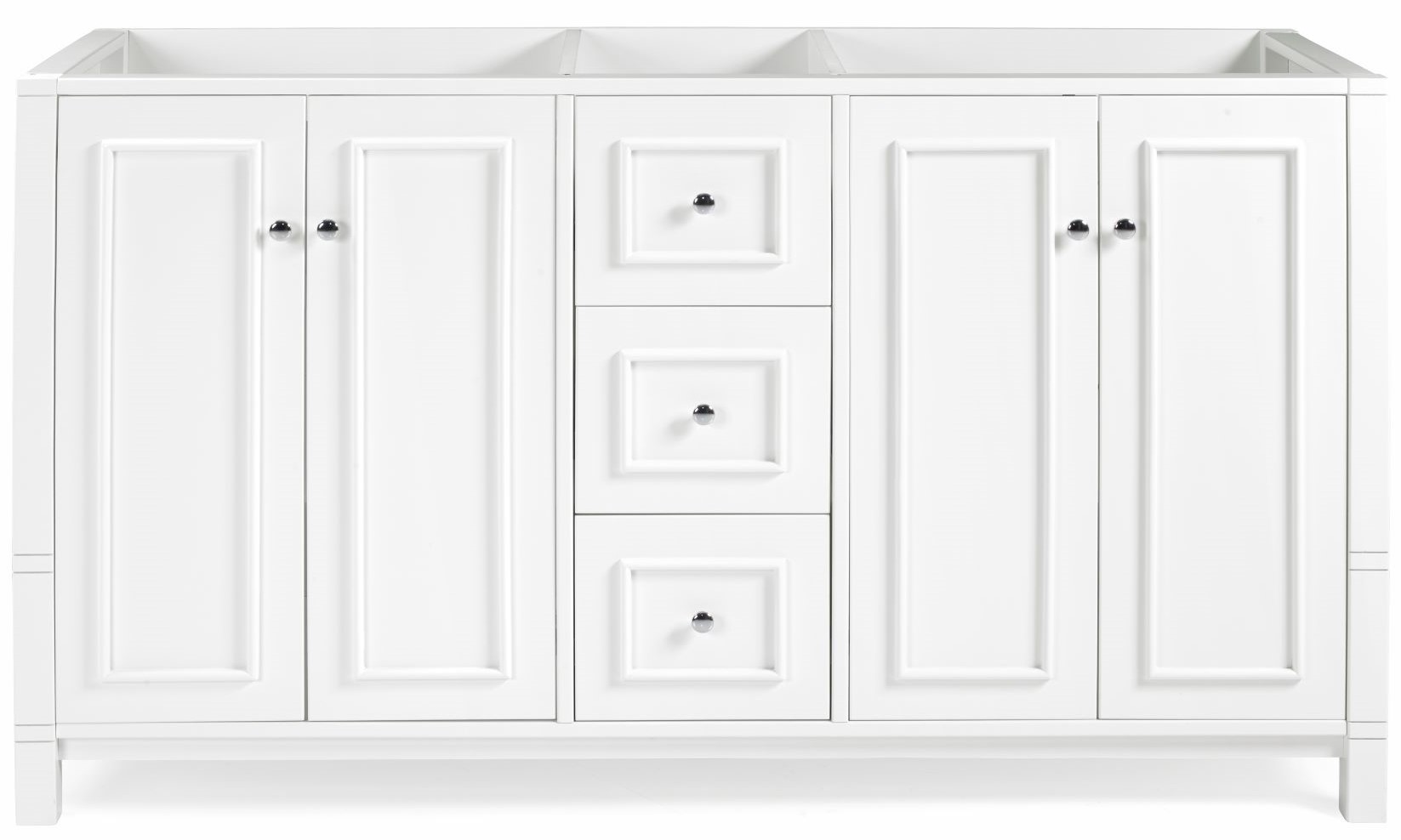 This vanity is sure to be the focal point in your bathroom. Strong lines and nickel hardware blend seamlessly to elevate your everyday bathroom style with charm. The cabinet offers spacious storage for linens, toiletries, or other bath essentials, and soft-close doors drawers ensure discreet, quiet operation. Constructed of solid pine and composite wood with polished nickel hardware and a beautiful white finish that is designed to complement any decor. Vanity top and sink are not included.Read More