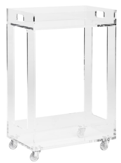 Sleek and simple design with clear acrylic material and chrome wheels make the small Bertie Bar Cart perfect for any space . With mobility to easily move from room to room, its perfect for entertaining!Read More