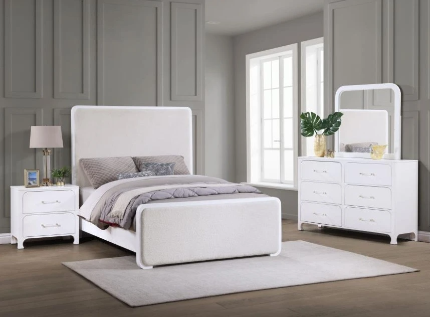 Create a dreamy spot for rest and relaxation with a four-piece modern bedroom set in pearl white to offer a fresh, inviting look. The bed features lightly textured beige upholstery on a padded head and footboard, ideal for lounging in the evening.Read More