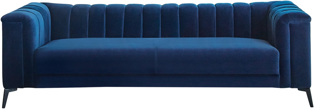 This magnificent transitional sofa will bring a dynamic radiance to your living space. It's upholstered in a stunning navy blue matte velvet fabric that you have to see to believe. Whether you sit or lie down, you'll love the bench-style seat with pocket coil springs for comfort and support. The shelter back and inside arms are crafted with deep vertical channels that are a visual delight. Tapered black metal legs bring the entire design together for a sofa that will transform the vibrancy of your home.