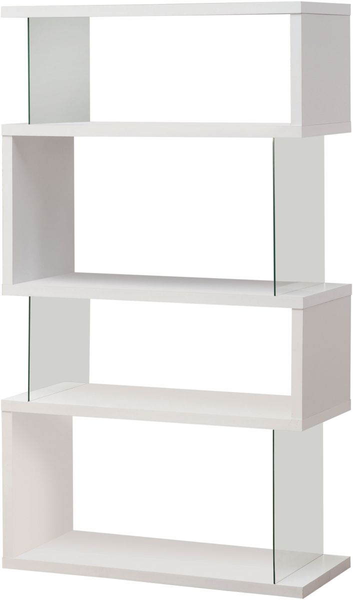 Its silhouette is accentuated by clear tempered glass panels to complete its chic, trendy look. Expert craftsmanship and top quality materials lend strength and durability. This bookcase is available in your choice of a black or white finish, giving you two stylish options to match your decor.