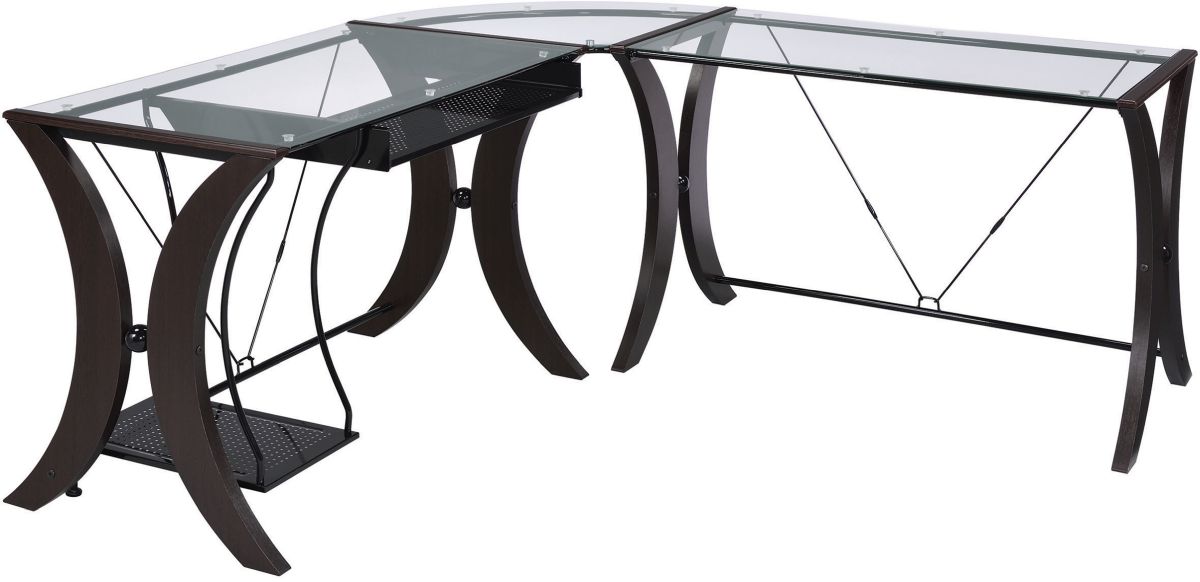 This contemporary, three-piece computer desk is an effortless blend of glamour and functionality. Its base is composed of gracefully curved metal lines for a smooth, sleek silhouette. Finished in gorgeous shades of cappuccino and glossy black, it boasts a truly elegant look.Read More