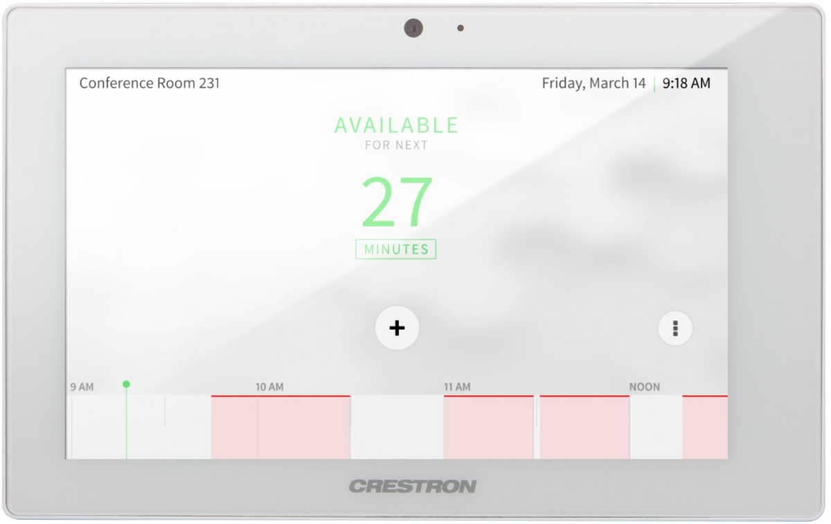 Crestron room scheduling touch screens help organizations to maximize productivity and manage usage for every meeting space. If desired, the room can be reserved on the spot for an ad hoc meeting. A CEN-ODT-C-POE occupancy sensor can also be paired to the touch screen, allowing for occupancy status to be reported instantly to the scheduling app for no-shows and unscheduled room usage.