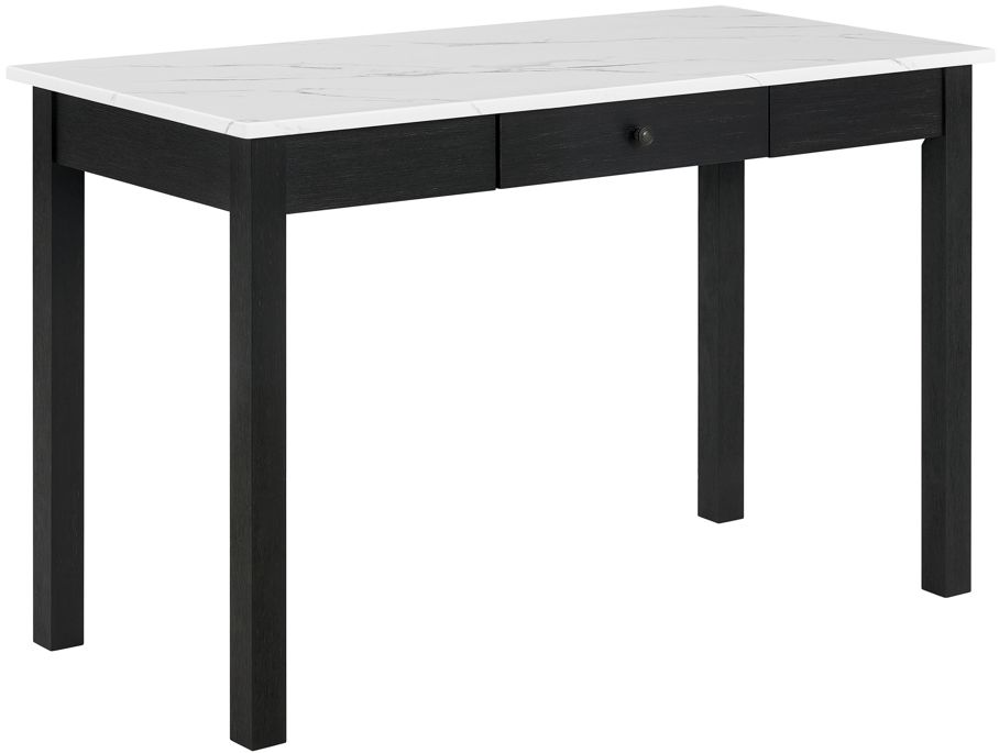 The sturdy black frame offers a bold contrast, creating a contemporary look that blends seamlessly with any décor. A built-in storage drawer keeps your workspace organized and clutter-free, making it perfect for productivity. Whether you're working, studying, or creating, this desk delivers the perfect balance of practicality and refined design.