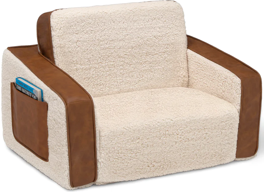 The Cozee Flip-Out Sherpa 2-in-1 Convertible Chair to Lounger by Delta Children is a cozy chair by day, laid-back lounger by night. This convertible seat easily flips open to reveal multiple ways for your child to relax--they’ll love to sit and read or watch their favorite movies on the chair but when it’s time for a nap, this seat folds out into a comfy sleeper bed. Big enough to fit two small kids comfortably in chair mode, it’s light enough to move around the house and is ideal for your children to share during playtime or sleepovers. The super-soft Sherpa and faux leather slipcover with easy-to-reach side pocket creates the ultimate retreat for your little one. The supportive foam construction will keep its shape and provides all-day comfort. Designed to ship in a super-small box, this lightweight foam kids’ chair and lounger may take up to 24 hours to fully expand once unboxed. Machine-washable slipcover zips off for easy cleaning. Recommended for ages 18 months+.Read More