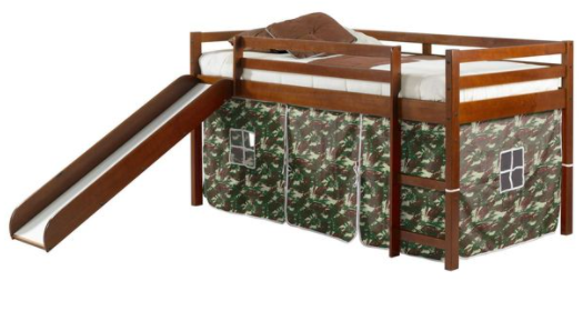 Transition your child from a toddler bed to an exciting twin low loft bed. The included slide makes it fun to get up in the morning. The warm light Espresso finish can easily match almost any decor. The camo tent fabric can make for a fun indoor tent area or hide all the stored items under the bed.Read More