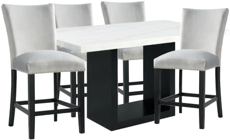 The Valentino 5-Piece Counter Height Dining Set will take your dining room from drab to fab! This dining set includes a table and four side chairs. The dining table features a natural, white marble table top, paired with a cool, cut-out table base.Read More