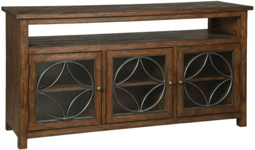 Russian pine solids and veneers finished in Tobacco merge traditional forms with rustic-style elements to deliver memorable pieces with rustic charm. It has three doors featuring a framed glass and metal overlay. One interior removable shelf behind each door.Read More