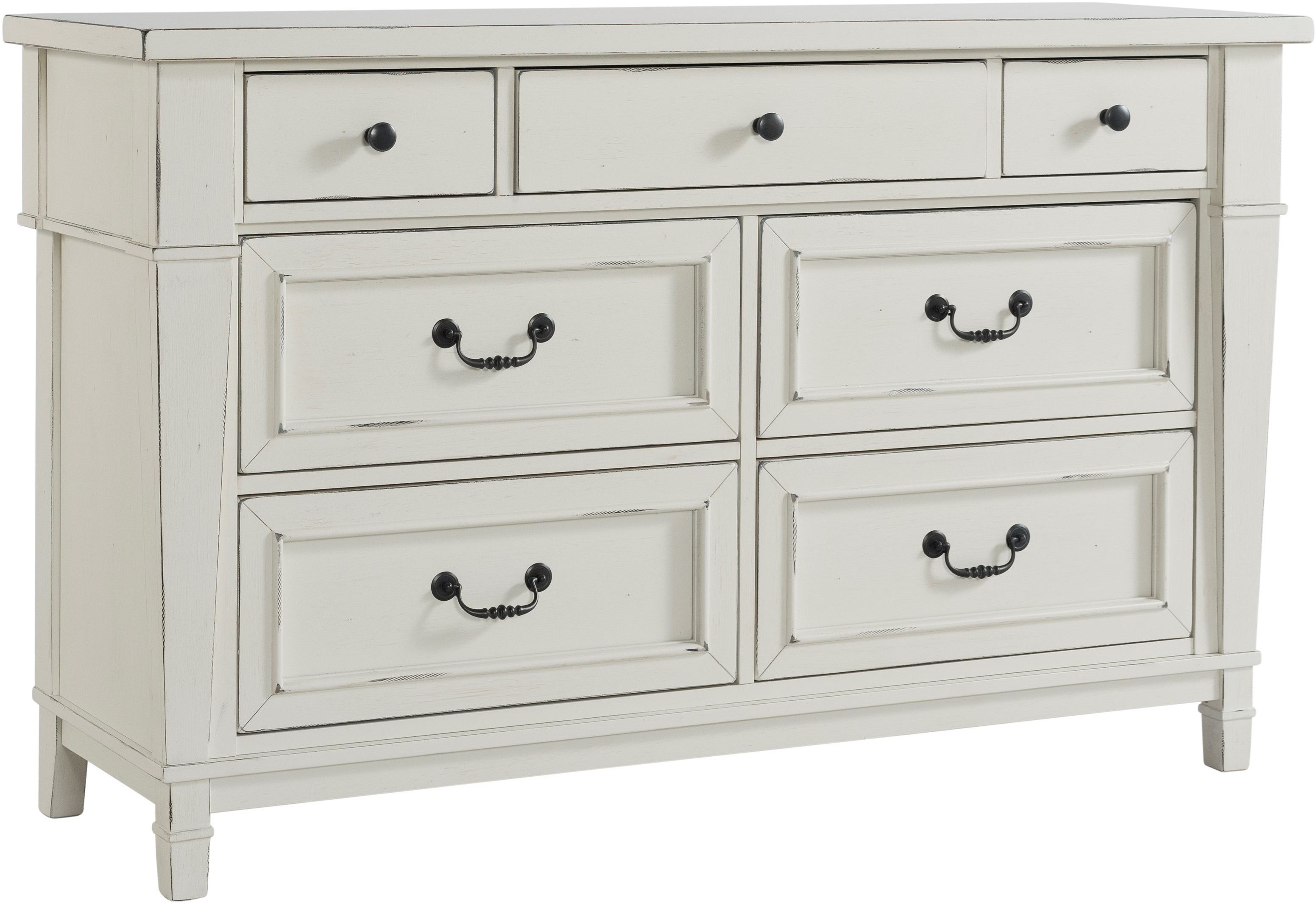 An antique white finish complements dark finish round knobs and bail handle hardware for a crisp, farmhouse style look. With seven drawers, this dresser offers ample storage for a bedroom. With a look that will grow with a child, this dresser is also perfectly scaled for smaller bedrooms.Read More