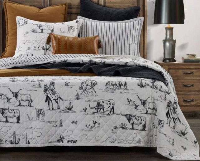 A playful Western take on traditional Toile de Jouy, our Ranch Life Western Toile Quilt Set takes you on a heritage journey through the American frontier, replete with natural scenery of wrangling cowboys, grazing cow herds, and frolicking desert wildlife.Read More