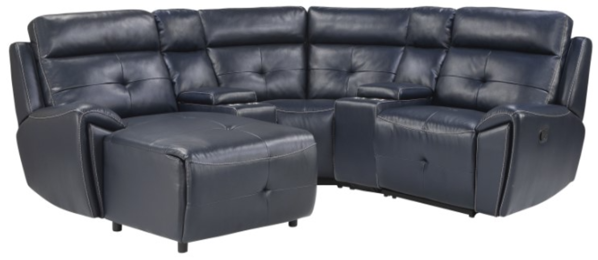 The Homelegance® Avenue 5-Piece Navy Manual Reclining Left-Arm Facing Sectional and Chaise offers a blend of comfort and functionality. It features plush pillow-back seating and premium faux leather upholstery. The sectional includes three manual recliners, a storage console with cup holders, and removable seat backs.Read More