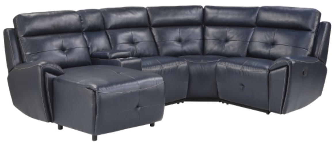 The Homelegance® Avenue 5-Piece Navy Modular Manual Reclining Left-Arm Facing Sectional and Chaise offers versatile seating with three reclining units, including a push-back chaise. Designed for comfort, it features foam padding over pocket coils and premium faux leather upholstery. The sectional includes convenient storage consoles with cup holders.Read More