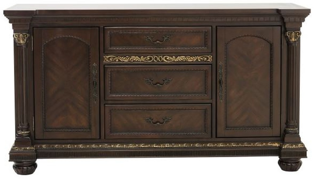 Blending the classic aesthetic of traditional design is the Russian Hill Collection. The nod to Old World styling comes in elements such as dental, rope and bead molding, shell motifs and faux marble accent, this dining collection goes above and beyond to create the desired look. The server features faux marble top, glass and wood door fronts, wine storage as well as service drawers. Further lending to the design of the server are the fixed antique finished hardware and pilaster accenting in the style of Corinthian columns.