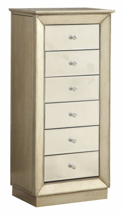 This bedside table features six storage drawers, two side doors with hook and a raised mirror on the top. We ensure each storage drawer is finely velvet lined. The multi-faceted wooden top rests on wooden base without legs with overall construction finished in charming antique gold. This will perfectly anchor any room decor with enduring look and classic style. This armoire does not have a lock.