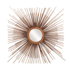 This small, square mirror features an arrangement of metal rods that create a dramatic starburst effect, set around a round mirror. It is finished in a striking, copper. Alone or in multiples, the Aster Mirror is a perfect focal point for an entryway, bathroom, bedroom or any room in your home. D-rings are affixed to the back of the mirror so it is ready to hang right out of the box! The glass on the piece is NOT beveled.Read More