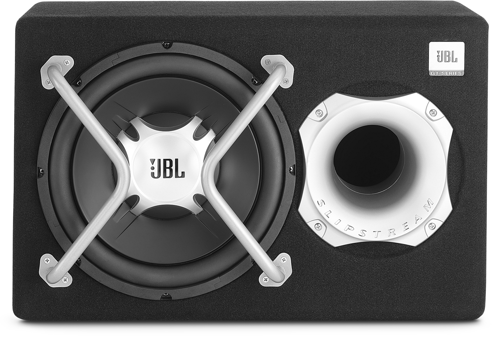 A proprietary Slipstream port is a special feature of the JBL® GT-BassPro12 powered subwoofer. The port’s dual flares form an adverse pressure gradient that eliminates port noise at high output – noise that signals that the port is no longer able to pass enough air to operate effectively. The Slipstream port provides clean, distortion-free performance even at the highest output levels.