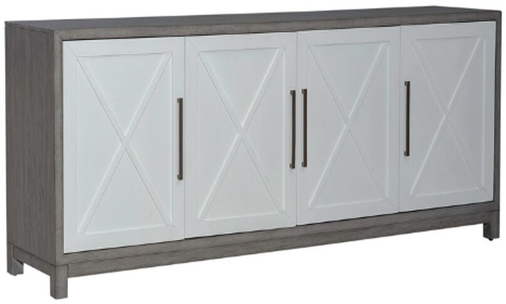 The seventy-eight inch TV console features picture frame molding with four wood framed doors with an X-pattern overlay that are accented with Pewter Wash bar pull hardware. The doors are supported by European soft close hinges. There are two large adjustable shelves behind the two center doors of the console, flanked by two smaller adjustable shelves on either side. Wire management provisions are added to help keep things looking neat and tidy. The block foot base adds a contemporary element to the clean lines of the TV console. The Palmetto Heights seventy-eight inch TV console offers a unique point of view that is sure to inspire.