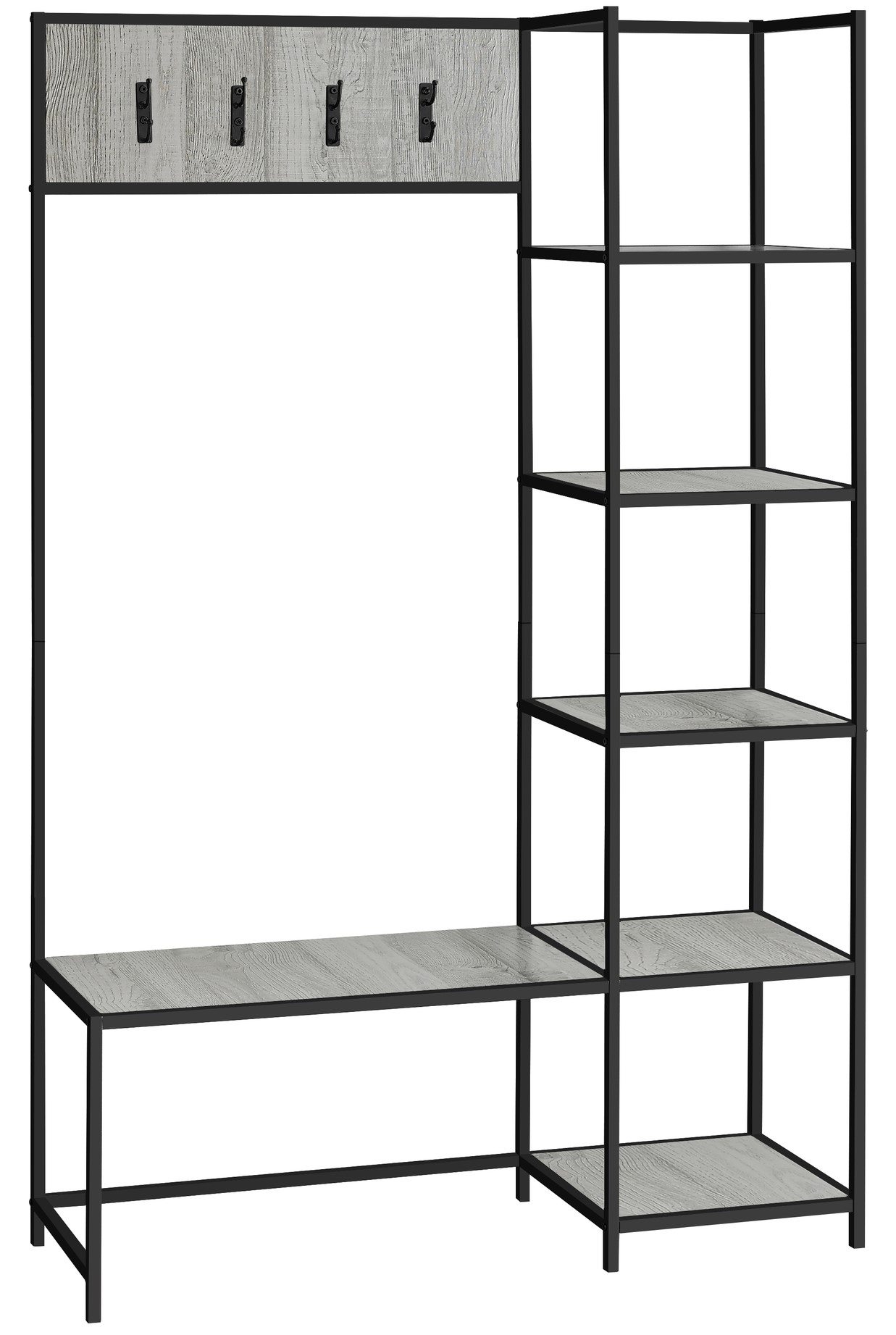 Keep your entryway or hallway tidy with this 3-in-1 hall tree. As a coat rack, it offers 8 hooks for hanging jackets, scarves, or bags. As an etagere, it features 5 shelves for storing backpacks, shoes, and more colorful baskets or a plant add a nice decorative touch. As a bench, it's a convenient place to sit and put on your shoes before you leave or to set down shopping bags when you return home. All panels are in a smooth, grey wood-look finish and are supported by a slender, black metal frame. With a streamlined, modern design that doesn't take up too much room, this hall tree is a great choice for smaller spaces.