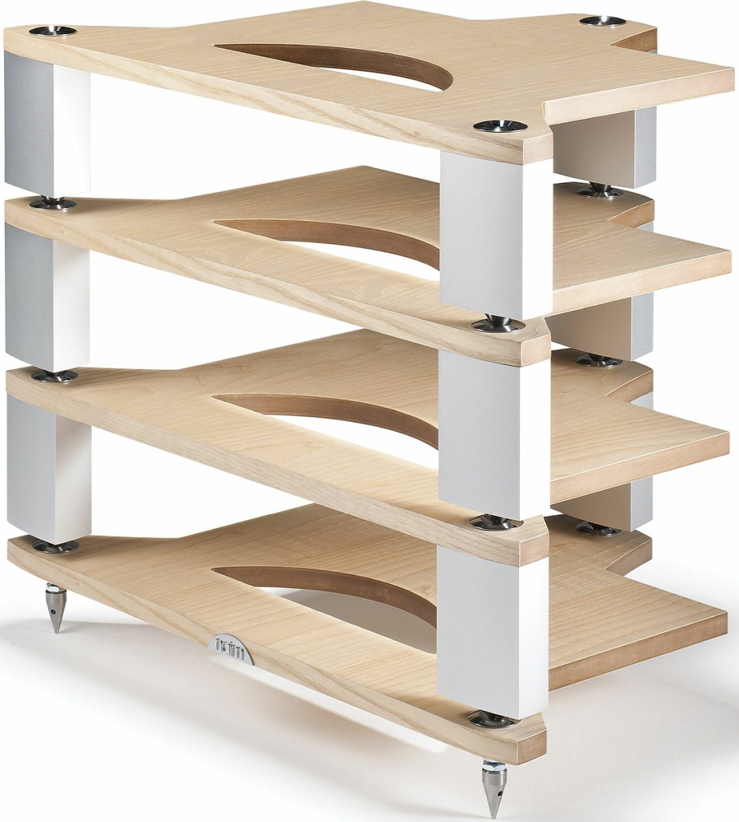 Rather than two-stage base level isolation, FraimLite incorporates just a single set of three cone and cup minimal contact interfaces. Each FraimLite shelving level then forgoes the Fraim’s glass sub-shelf to support equipment directly on veneered composite panels.