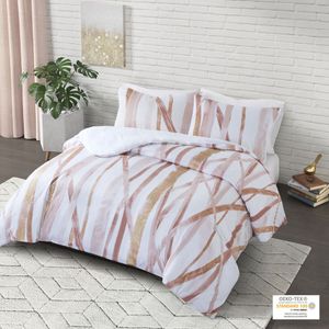 Glamorize your bedroom with the gorgeous style of the CosmoLiving Jorja Cotton Metallic Printed Comforter Set. This 100% cotton comforter flaunts an abstract blush brushstroke print with gold metallic details to create a chic modern look.Read More