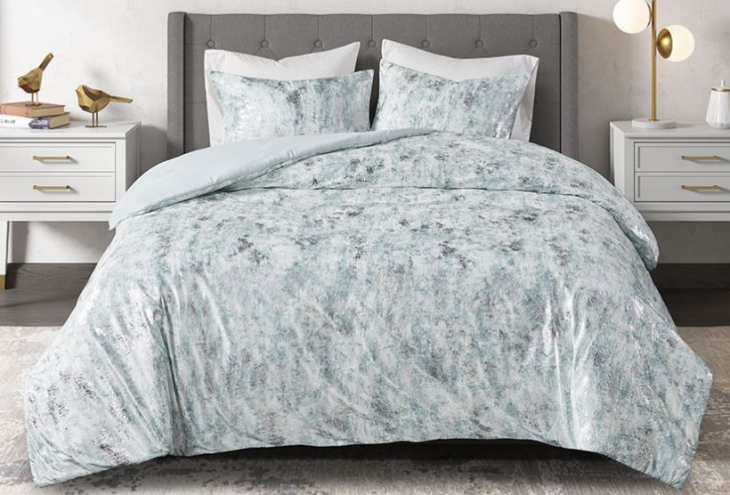 Bring that perfect touch of glam to your bedroom with the CosmoLiving Pearl Metallic Printed Velvet Comforter Set. This velvet comforter features distressed silver metallic details printed on the ultra-soft fabric, for a glamorous look. Two matching shams pair stunningly with the comforter to complete the flashy ensemble.Read More