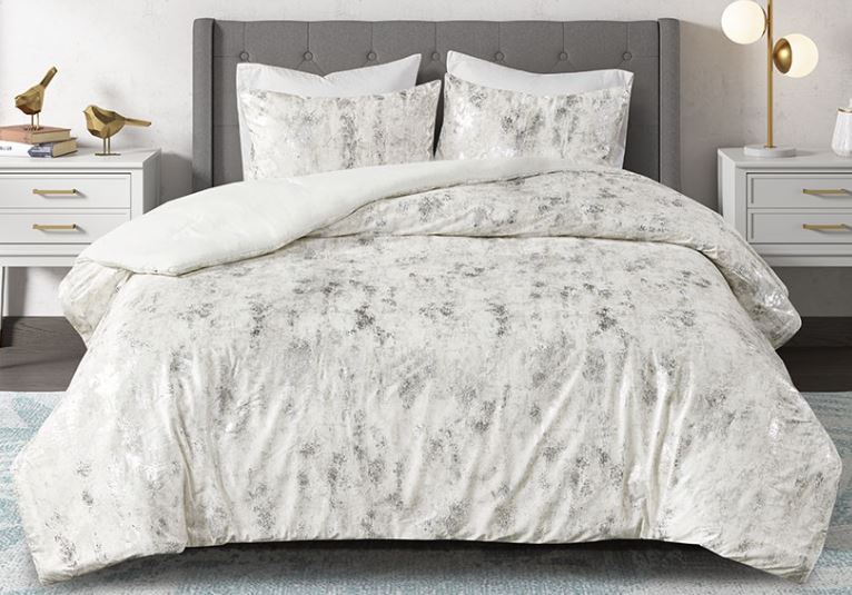 Bring that perfect touch of glam to your bedroom with the CosmoLiving Pearl Metallic Printed Velvet Comforter Set. This velvet comforter features distressed silver metallic details printed on the ultra-soft fabric, for a glamorous look. Two matching shams pair stunningly with the comforter to complete the flashy ensemble.Read More