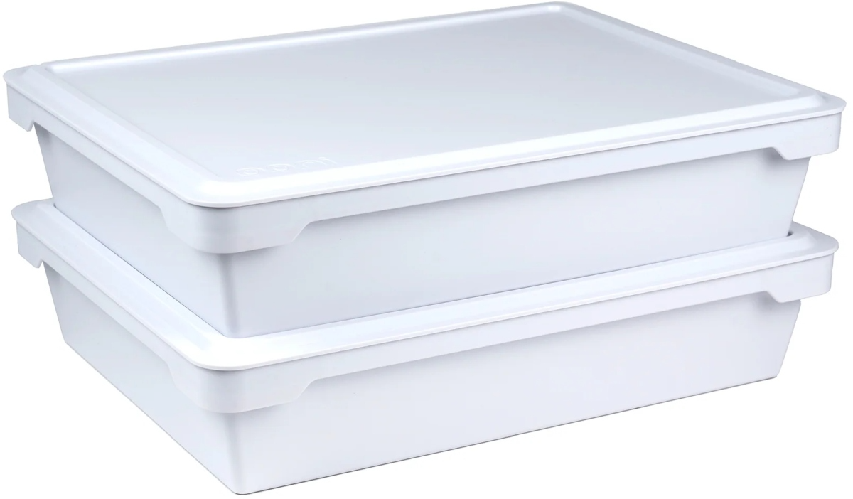 We designed every aspect of the Ooni Pizza Dough Boxes with pizza makers in mind. We made the boxes white to minimize heat absorption and avoid over-proofing your dough. We gave them smooth, tapered internal walls so your dough balls are easy to remove. We molded in easy-grip handles for transport. We used durable, food-grade plastic for easy cleaning. And for all of us with limited cabinet space, the dough boxes nest inside each other for storage.
