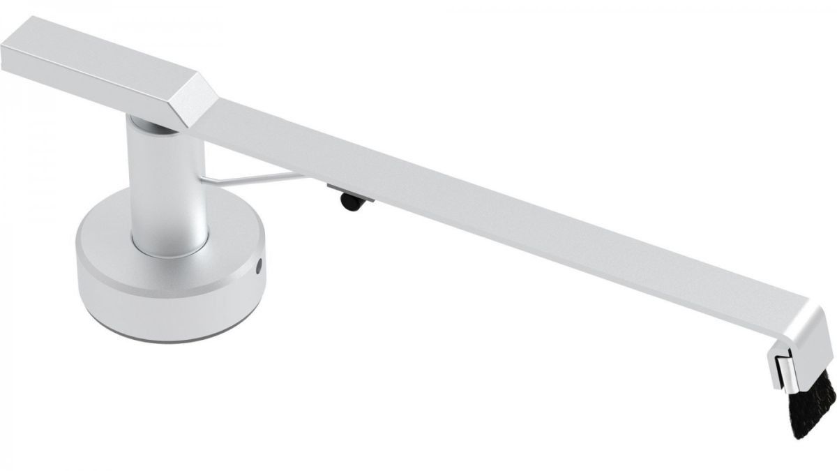 The magnetic attraction between the neodymium magnet – based in the top part of the cylinder – and the [Fe] core/counterweight stabilizes the record brush. Moreover, the distance between the neodymium magnet and the [Fe] core/counterweight is carefully chosen to ensure a specific magnetic stabilization force. As the aluminium of the brusharm is paramagnetic, it acts like an additional space between the neodymium magnet and the [Fe] core/counterweight. Sweep it S2 is height adjustable within a range of about 1cm. The position can be locked with the set screw on the base. With this mechanism, it is possible to adjust the height of the arm of the record broom in order to align it horizontally with the platter. A correct horizontal alignment ensures the correct tracking force of about 6g.