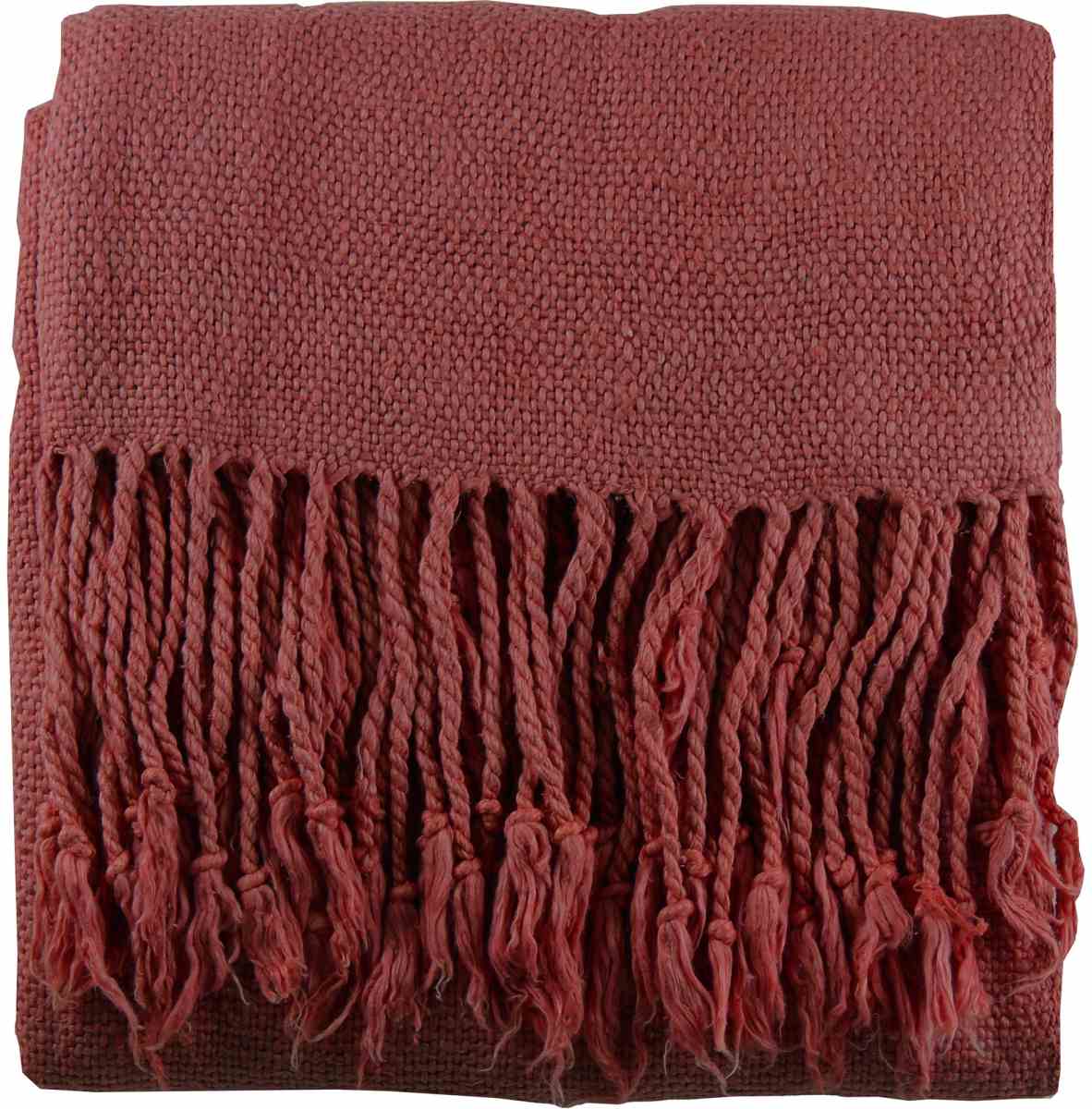 The Sinoko Burgundy 50" x 60" Throw Blanket features unique colors and design. This cotton blanket features fringe edges and a woven pattern.