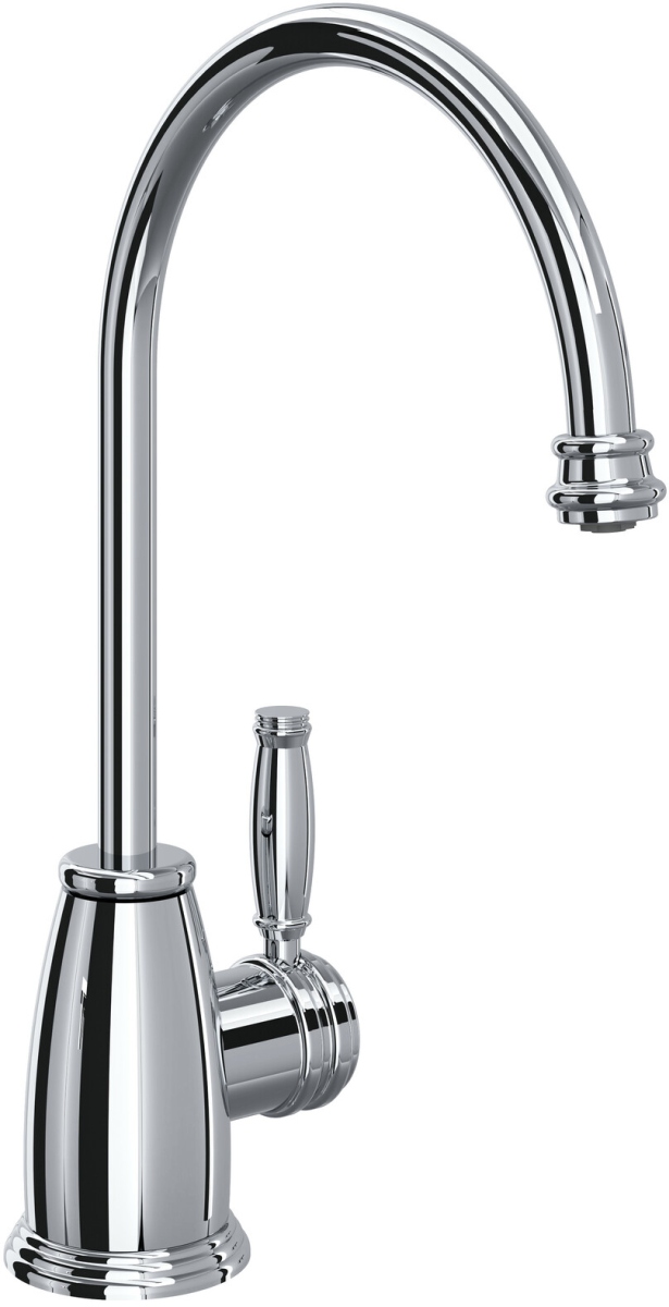The streamlined, sleek loop of the faucet is balanced by a single lever handle reaching skyward. Luxurious shine, notched detailing, and a fluted spout add Deco styling. Gotham is truly a must for modern and transitional kitchens of style.