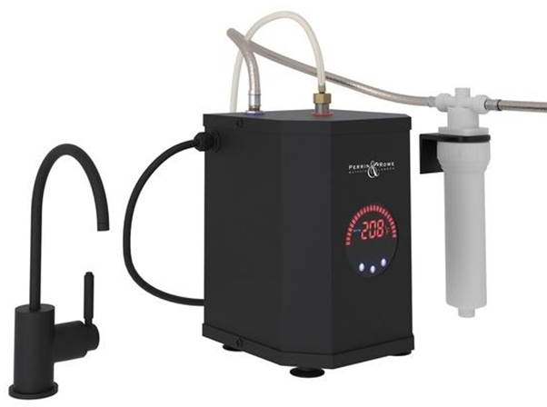 Steaming hot water is in style with ROHL Hot Water Faucets. Our Hot Water Faucets will offer instantly hot filtered water to brew tea, blanch vegetables, quick-thaw frozen foods, prepare hot cereal, loosen jar lids and more. The system includes an 81 ounce (5/8 gallon) stainless steel tank and an easy-to-adjust temperature control -- delivering hot water at temperatures up to 210 degrees Fahrenheit. With the above industry standard 1,500 watt heating element, the tank is designed for quick recovery for continued use and is equipped to provide up to 100 cups/hour of near-boiling water. Hot water faucets may be purchased individually or as a package with faucet, filter and high performance tank. ROHL Filtered Hot Water Faucets, featuring Fluhs spring return cartridge, offer hot, clean water with ease and style.