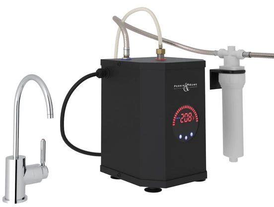 Steaming hot water is in style with ROHL Hot Water Faucets. Our Hot Water Faucets will offer instantly hot filtered water to brew tea, blanch vegetables, quick-thaw frozen foods, prepare hot cereal, loosen jar lids and more. The system includes an 81 ounce (5/8 gallon) stainless steel tank and an easy-to-adjust temperature control -- delivering hot water at temperatures up to 210 degrees Fahrenheit. With the above industry standard 1,500 watt heating element, the tank is designed for quick recovery for continued use and is equipped to provide up to 100 cups/hour of near-boiling water. Hot water faucets may be purchased individually or as a package with faucet, filter and high performance tank. ROHL Filtered Hot Water Faucets, featuring Fluhs spring return cartridge, offer hot, clean water with ease and style.