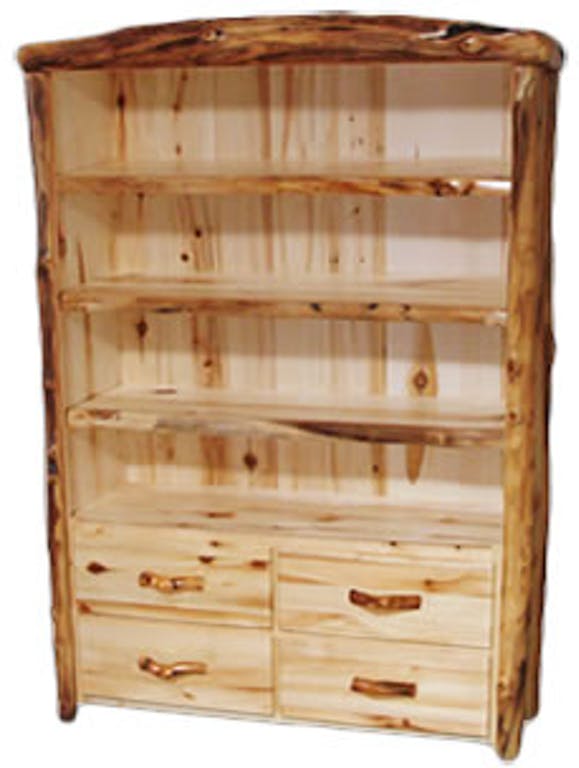 54"W Tall bookcase with two shelves and two drawers. Made of wild panel with more noticeable deeper wood grain character and natural log in rustic style.Read More