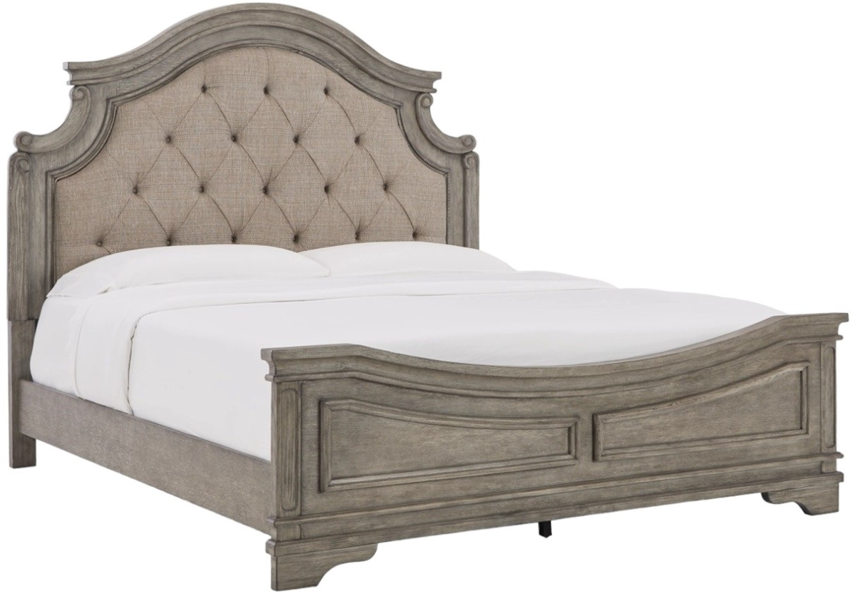 Cottage quaint styling and quality construction make this king panel bed a dream come true. An antiqued gray finish and beige upholstery provide rustic warmth. The ornately shaped headboard marries classic design with homey charm for an elegant bedroom must-have.Read More